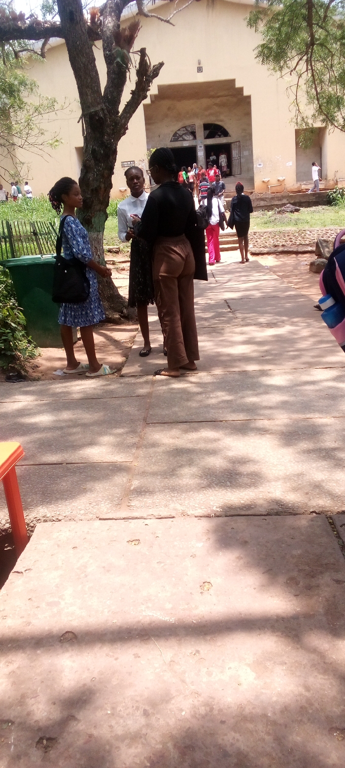 three women standing on a concrete path. The women are in the foreground of the image. The woman in the center of the image is wearing a black shirt and brown pants. She is facing the left side of the image, but her gaze is directed toward the woman on her left. This woman is wearing a blue and white floral dress and a black shoulder bag. She is facing the woman in the center of the image. The woman on the far left of the image is wearing a white shirt and a black skirt. She is facing the center of the image, but her gaze is directed toward the woman on the right. There is a green trash can to the left of the women on the path. The image was taken in front of a building with a beige exterior, which is located on the right side of the image. There is a tree in the foreground of the image. Several people are visible in the background walking on the path and around the building. The location of the image is the town of Okigwe, Nigeria. The coordinates of the location are latitude: 5.824, longitude: 7.394. The weather is sunny and there are shadows cast from the buildings and trees on the path.