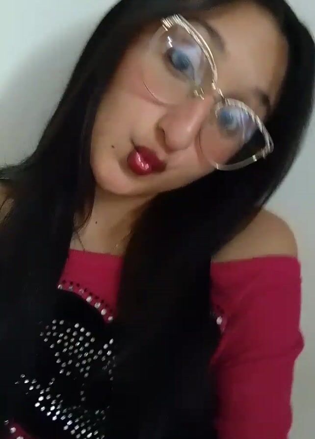 A young woman is posing for the camera in front of a plain white wall. She has long, dark hair and wears clear, gold-framed glasses. Her lipstick is a dark red color. She's wearing a pink, off-the-shoulder top with a black heart design embellished with rhinestones. She makes a kissing face at the beginning of the video, and then the camera is tilted and rotated.