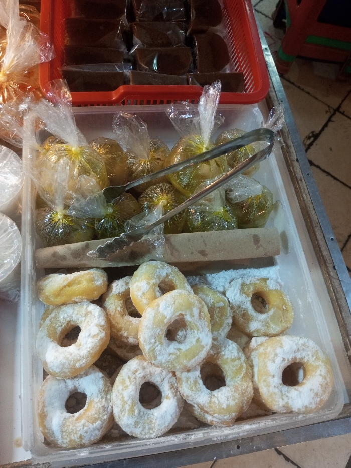 The image captures a close-up, high-angle view of various food items displayed for sale at a market stall in Lê Thanh Nghị Ward, Vietnam. In the upper segment, a red plastic basket holds multiple dark brown, individually plastic-wrapped confectionery items, predominantly rectangular with some semi-circular edges. Below this, a white translucent plastic tray features two distinct layers of food. The upper layer contains numerous small, round, yellowish-green items, each individually sealed in a clear plastic bag tied with a yellow closure. A pair of silver metal serving tongs rests diagonally across these bagged items. A horizontal brown cardboard tube or rolled paper acts as a divider, separating the bagged items from the lower section of the tray. This lower section contains approximately 15-20 light-golden, ring-shaped donuts, generously coated with white powdered sugar. The overall display rests on a metallic surface, with a blurred reddish-orange object and a light-colored patterned floor visible in the background.