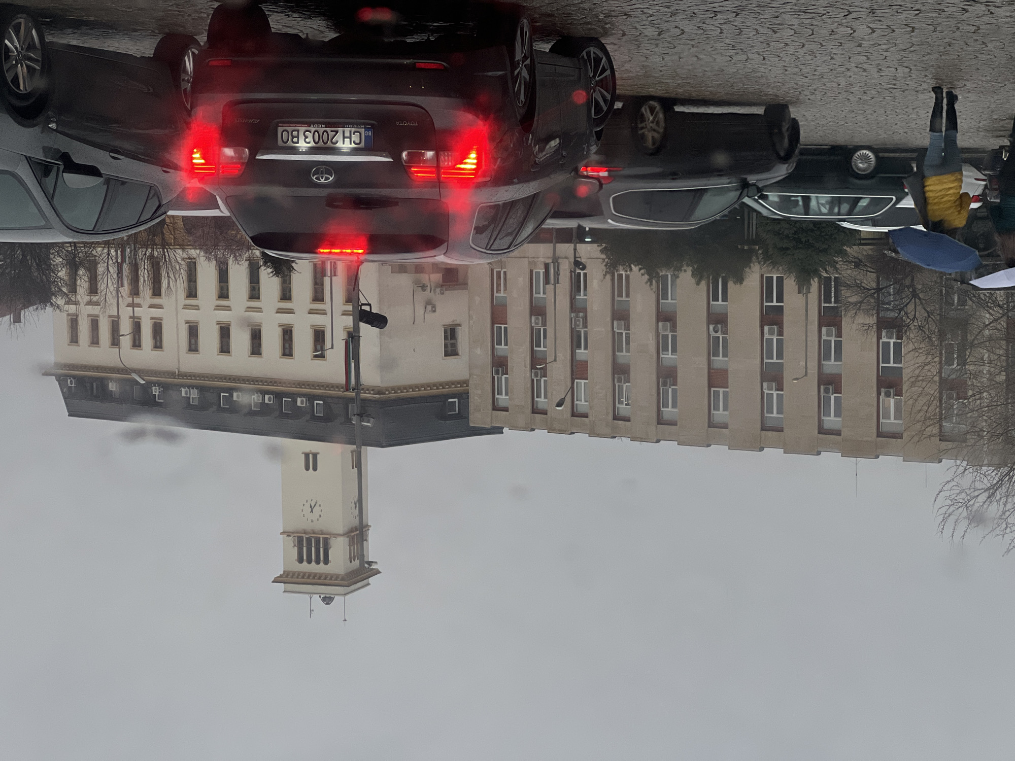 The image depicts a street scene in Sliven, Bulgaria, on an overcast day, with evidence of recent rain or ongoing light precipitation. The prominent building on the right is the Sliven Municipality building, characterized by its light-colored facade, dark sloped roof, and a tall, multi-tiered clock tower featuring four clock faces and arched openings at its apex. To the left of the municipality building stands a beige, multi-story building with numerous uniform windows and visible external air conditioning units. In the foreground and midground, a line of vehicles is present on a wet, cobblestone street. A dark grey Toyota Avensis wagon occupies the central foreground, displaying illuminated red taillights and a Bulgarian license plate "CH 2003 BO". To its immediate right, a dark grey hatchback (possibly an Opel Astra) is partially visible. Further to the left, a dark-colored station wagon (possibly a BMW) and a white SUV are also visible. Two individuals are walking on the wet cobblestone pavement on the far left. One person, seen from behind, wears a yellow jacket and dark boots, holding a blue umbrella open over their head. Another person, partially obscured, walks alongside, holding a white umbrella. Bare tree branches are visible on the left, and a street light pole stands between the two main buildings. Traffic appears to be either stationary or moving slowly.