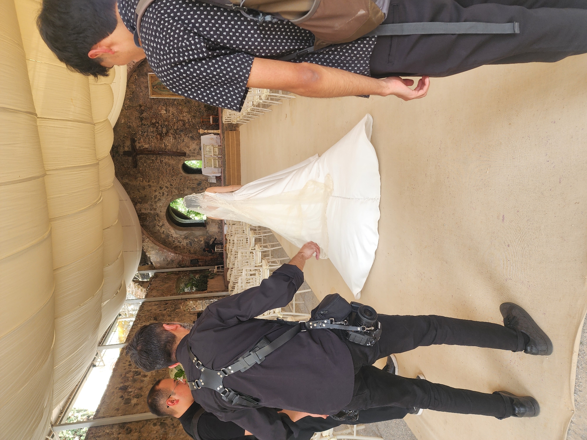 The image captures a wedding scene in Progreso, Mexico. A bride in a white wedding dress walks down a stone aisle lined with white chairs towards a stone structure with a cross in the interior. Two men are present: One is looking down at the bride and the other is assisting with carrying the wedding dress. The second man wears black clothing with a harness, and a camera is attached to it. The scene occurs in an outdoor area surrounded by stone architecture.
