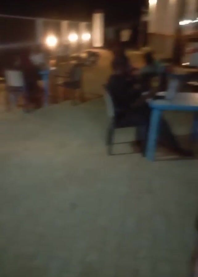 n outdoor patio area at night. Several people are seated at small tables with chairs. The patio is lit by overhead lights attached to a white structure in the background. The ground appears to be paved with light-colored stones. Some people are visible walking in the background, and a motorcycle is parked near the lit structure. The video seems to have been taken with a shaky camera.