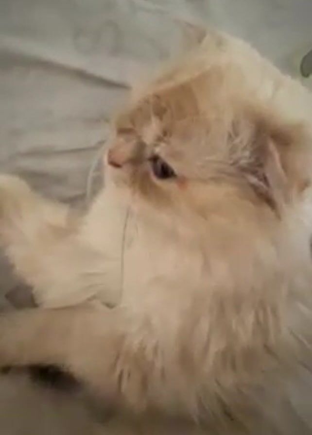 A close-up video features a light-colored, fluffy cat lying on a gray patterned bed sheet