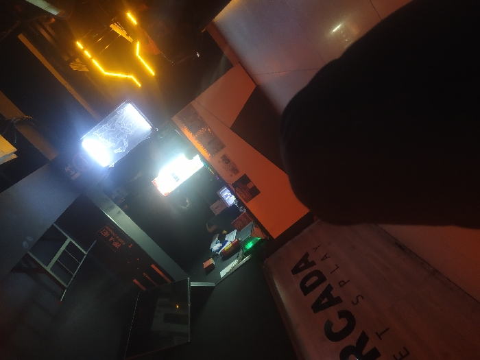 The image captures an indoor commercial space in Tashkent, Uzbekistan, taken from a low, severe diagonal angle. The immediate foreground, occupying the lower left and central-left, is obscured by a large, dark, amorphous object, consistent with a human limb. In the upper-left segment, a wooden-textured sign is partially visible, displaying the dark capital letters "ARCADA" followed by "ET SPLAY" or "HET DISPLAY". The midground features a light-colored counter or display unit. Several digital screens are active and brightly illuminated. One screen emits a strong white light, while another displays a white, schematic-like graphic, possibly a map or circuit diagram, against a dark background. Above these screens, a dark horizontal panel features white text, clearly legible as "VIP-A HET", with "HET" being a Russian word. Reflections of overhead structures or lighting are visible in dark, possibly mirrored, surfaces above the panel. To the far right, a partial view of a metal framework or shelving unit is discernible against a dark wall. The lower-right section of the image shows a floor surface illuminated by several angular, glowing yellow LED strips, forming a distinct geometric pattern. The overall lighting environment is dim, with prominent illumination originating from the various display screens and the yellow floor lights, creating high contrast. No individuals are clearly visible within the scene, and no actions or interactions are depicted.