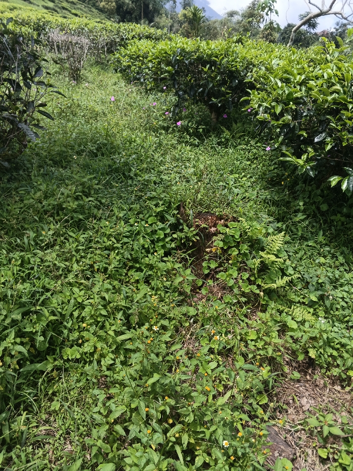 Lush greenery dominates the scene. A variety of plants intermix, featuring small yellow and white flowers amidst broader green leaves. A tree stump, partially covered in vegetation, anchors the center. Behind, taller shrubs and cultivated tea bushes fill the midground, leading up to a hazy mountain backdrop. The scene evokes a wild yet managed natural environment.