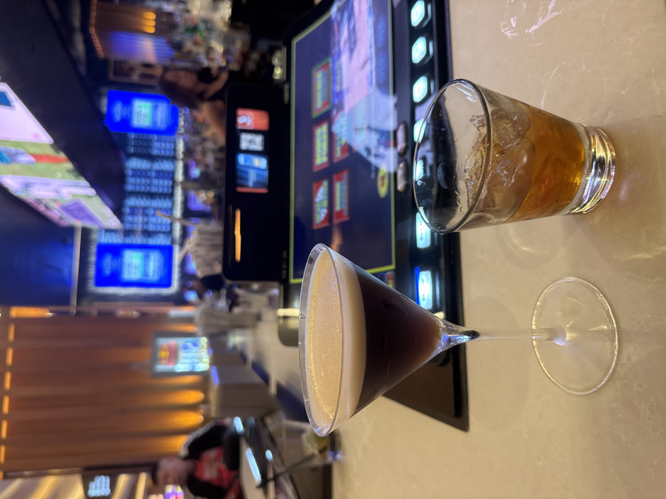 The image depicts an indoor scene at a casino bar located on the Hollywood Seminole Reservation, United States of America. In the immediate foreground, centered on a light-colored, reflective bar top, are two alcoholic beverages. To the left is a clear stemmed martini glass containing a dark brown liquid topped with a thick, frothy, light brown layer. To the right, a short, clear tumbler glass holds an amber-colored liquid with multiple ice cubes. Behind the drinks, integrated into the bar surface, is a black electronic gaming machine with an illuminated screen displaying various colorful graphical elements, resembling a slot machine or video poker interface. Further beyond, a dark-haired female individual, presumably a bartender, is partially visible behind the bar amidst an array of bottles and bar equipment. The background reveals a large, open casino environment. High above, multiple large digital screens display sports events and what appear to be betting odds or statistics. Several prominent vertical blue screens with white text are also visible. To the far left in the background, a male individual wearing a dark jacket with red accents is seated at another section of the bar or a table. The overall lighting is a mix of ambient warm tones from architectural elements and bright illumination from the various electronic displays.
