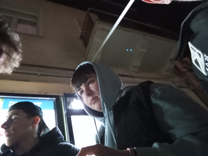 The scene depicts four individuals gathered outdoors at night in Troyan, Bulgaria, viewed from a low-angle perspective. In the mid-left foreground, a young male is shown in profile, facing left, wearing a dark baseball cap reversed and a dark hooded jacket. His face is partially illuminated by a bright, rectangular sign or display panel, visible in the lower-left background, emitting blue and green light. Adjacent to him on the right, a second young male wears a light grey hooded sweatshirt with the hood drawn over his head, atop a dark vest or jacket. He looks upwards and to the right with a neutral expression. A dark, possibly braided, bracelet is visible on his left wrist. A thin white cord or strap extends upwards from near his right shoulder, out of frame. A partial, out-of-focus view of a third individual's head with light, curly hair is visible in the upper-left corner. On the far right, a fourth individual's upper shoulder and chest are partially visible, clad in a dark hooded jacket featuring a white logo, partially discernible as "R_V" or similar, on the chest. The background consists of a light-colored building facade with a visible window in the upper-left and a balcony railing in the upper-right. A horizontal white pipe or conduit runs along the building's exterior. Two distinct blue light reflections are present on an unseen reflective surface in the upper-right background. The overall lighting is artificial, suggesting nighttime conditions.