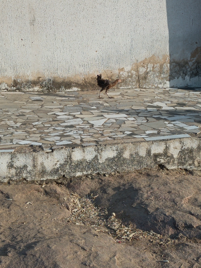 A solitary chicken struts across a tiled patio, its dark feathers and slender legs contrasting against the fragmented stone. Behind it stands a weathered wall, its paint peeling and stained, hinting at age and exposure. The patio's edge transitions to a rough, rocky ground scattered with dry debris. The scene is bathed in sunlight, casting shadows that accentuate the textures of the surfaces.