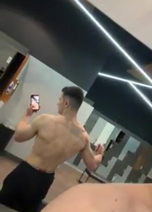 A shirtless man is taking a selfie in a gym locker room while flexing his back muscles