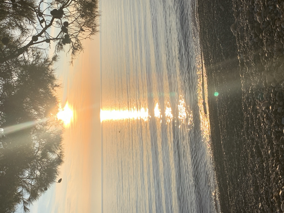 The image captures a serene seaside scene at sunrise. A tree's silhouette, adorned with pinecones, frames the left side of the shot. The sun, low on the horizon, casts a radiant golden glow across the calm water, creating a shimmering path of light. Gentle waves lap against a pebbly beach, with the shoreline extending into the right side. The overall atmosphere is tranquil and luminous.
