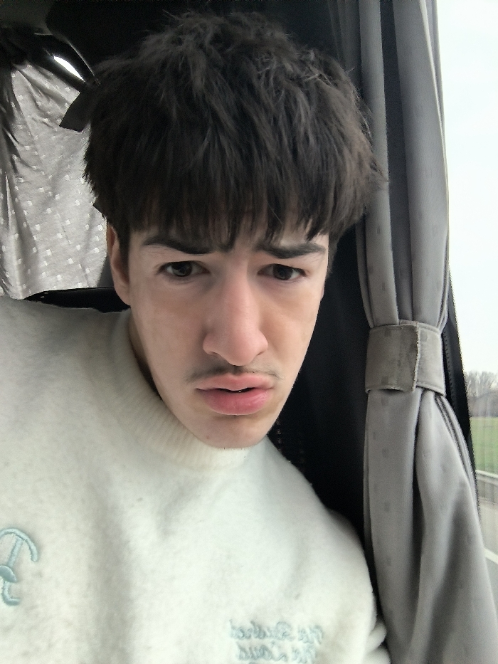 A young male is depicted in a close-up, chest-up shot, looking directly into the camera. He possesses dark, medium-length hair styled with bangs covering his forehead and a faint, thin mustache. His expression is neutral with slightly parted lips. He is wearing a cream or off-white turtleneck sweater featuring light blue embroidery: an anchor symbol on the upper left chest and partially legible cursive text on the lower right chest area. The background indicates an interior setting, likely a vehicle, with a patterned, light-colored curtain visible on the left and a similar curtain tied back with a velcro strap on the right. Through the window on the right, a blurred outdoor scene with green foliage under an overcast sky is visible. The scene is located in Sofia, Bulgaria.