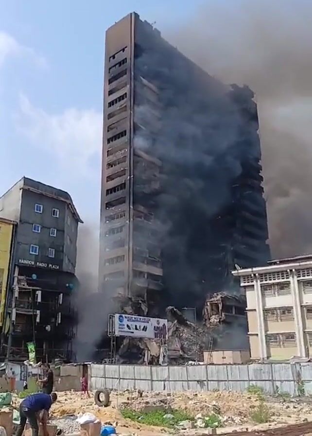 A high-rise building, badly damaged and covered in black smoke, stands in a busy urban area