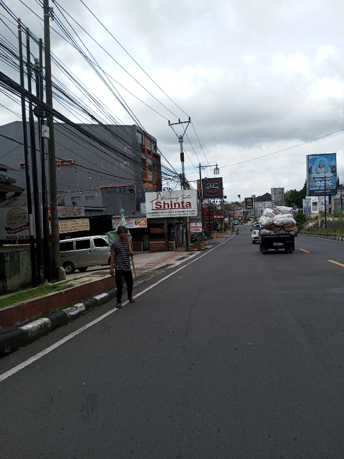 The image depicts an urban street scene, identified as being in the city of Taohom, Laos. The perspective is from the roadside, looking down a paved, two-lane asphalt road under an overcast sky. On the immediate left, a black and white striped curb separates the road from a paved sidewalk, along which multiple utility poles supporting a dense network of overhead electrical and communication wires are positioned. A single adult male is walking on this sidewalk towards the left, away from the foreground. He is wearing a horizontal striped short-sleeved shirt, dark trousers, and sandals. He carries a long wooden stick over his right shoulder, from which a light-colored bag or cloth is suspended. His left hand holds the stick near his waist. Behind the man and utility poles, a silver minivan is partially visible, parked parallel to the sidewalk. Adjacent to this, a multi-story building with a grey facade and distinct orange-brown sections is visible. Below this building, several commercial establishments are present. A prominent sign for "Warung Sate Shinta" is displayed, with additional Indonesian text indicating "Sejak 1977" (Since 1977), "Buka 24 Jam" (Open 24 Hours), and "Menerima Catering & Kambing Guling" (Accepts Catering & Roasted Lamb). Other visible signs include "HOTEL" and "CHINESE FOOD." Further down the road, a dark-colored flatbed truck heavily laden with numerous large white sacks is traveling away from the viewer on the right lane. A smaller white vehicle is visible behind the truck. In the background, on the right side of the road, multiple billboards are visible against the cloudy sky.