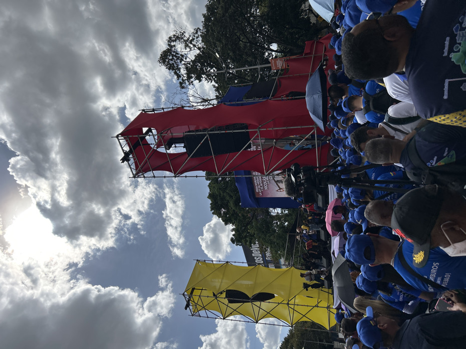 A crowd wearing blue hats congregates, with yellow and red fabric structures on scaffolding towering above. The yellow structure has a black shape, possibly a logo. Behind the crowd, a banner displays writing in Spanish. The sky is filled with white clouds. A small pink umbrella and numerous dark umbrellas are interspersed within the crowd.