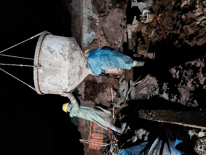 Two construction workers guide a concrete bucket pouring cement into a trench. One worker, wearing a yellow hard hat and light green raincoat, is positioned beneath the bucket. Another worker in a blue raincoat oversees the operation from the side. The trench is lined with wooden planks, and the dark earth around it suggests it's a nighttime scene. An orange crate and various construction tools are scattered nearby.