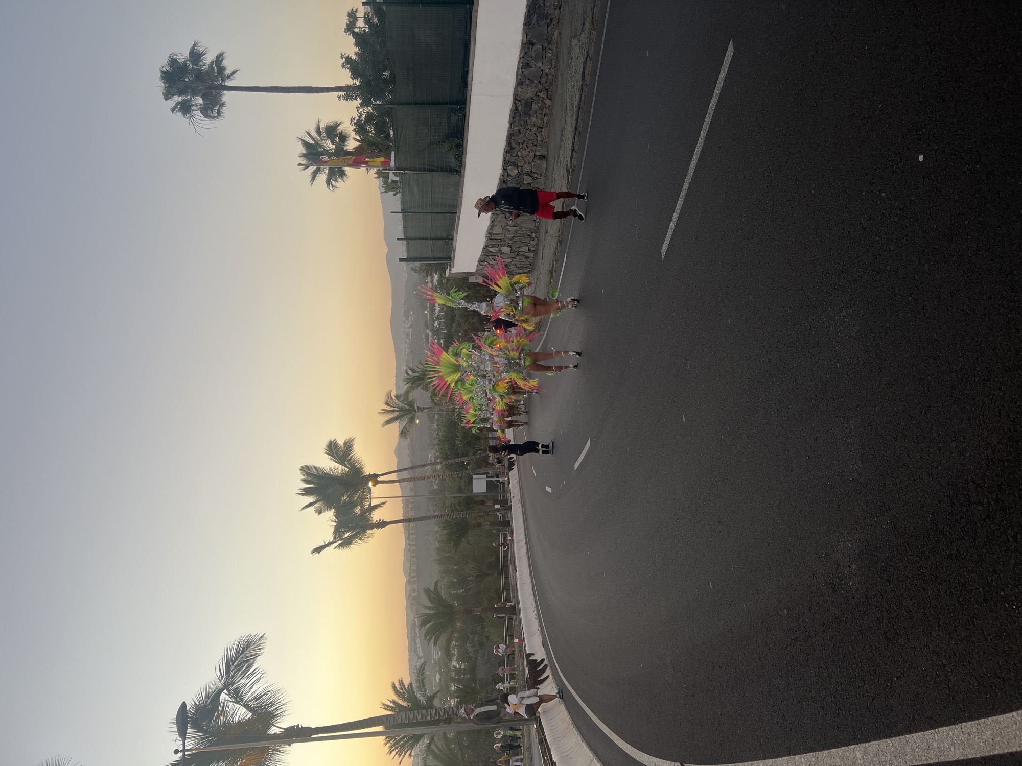 street scene in San Bartolomé de Tirajana, Spain, during what appears to be a carnival procession. Palm trees line the left side of the road. Several people are walking along the road. Some are dressed in colorful carnival costumes. One man is wearing a straw hat, a dark jacket, and red shorts. A single white stripe is painted on the asphalt road, marking a lane. The sky is light, indicating either dawn or dusk. In the background, there is a glimpse of mountains. A wall runs along the top edge of the image.