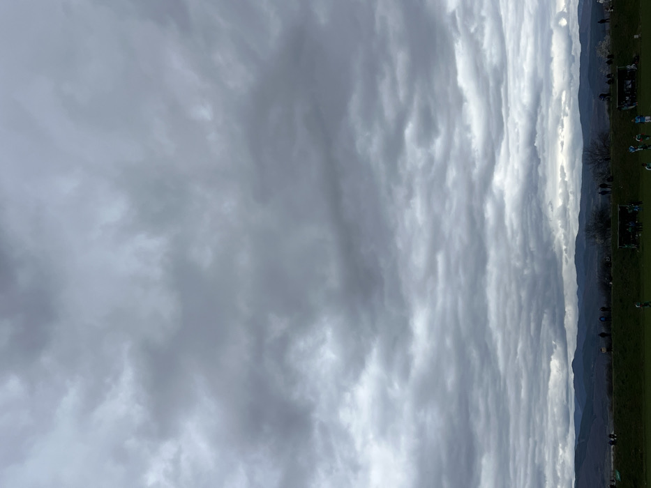 The image captures an outdoor football (soccer) match in Koprivlen, Bulgaria, under a heavily overcast sky. Dense, grey stratocumulus clouds fill approximately 70% of the frame, indicating thick cloud cover. A distant, dark mountain range spans the horizon line. Below the mountains, a raised green earthen bank extends horizontally, populated by scattered, silhouetted human figures identified as spectators. Sparse, bare trees are visible along this bank, particularly on the right side. In the foreground, a vibrant green sports pitch contains multiple individuals engaged in play. These individuals are dressed in athletic attire, primarily light blue/teal and green jerseys, representing two teams. A dark-framed goal structure with netting is present on the right side of the pitch.