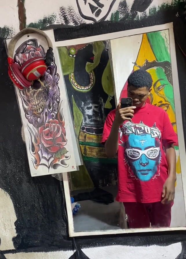 A young man stands in front of a mirror in a brightly decorated room, taking a selfie. He is wearing a red t-shirt with a blue-faced image and shades, and matching red pants. The wall behind him is covered with graffiti, including the words "INSIDE AFRICA," a stylized map of the continent, and various painted figures and designs. To the left of the mirror hangs a piece of art featuring a skull, rose, and headphones. The man is focused on his phone, adjusting his pose slightly as he captures the image.