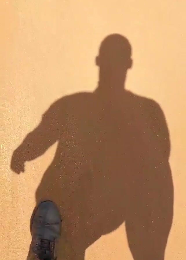 person's shadow walking on a sandy surface