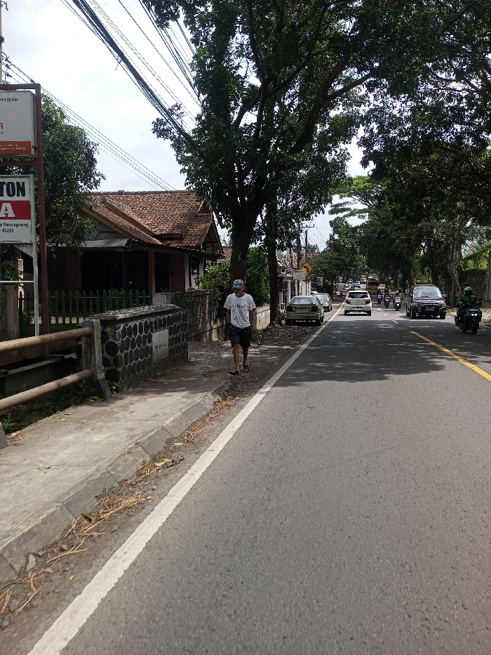 The image depicts an outdoor daytime street scene in Khajuripada, India, under an overcast sky. A single adult male is walking on a concrete sidewalk along the left side of an asphalt road, heading away from the immediate foreground. He wears a white short-sleeved t-shirt, dark patterned shorts, a light-colored baseball cap, and dark sandals. To his left, a dark gray stone barrier with hexagonal patterns, capped with lighter concrete, forms part of a structure, possibly a bridge or culvert, and features two horizontal brown metal railings. Beyond this barrier and a green picket fence, a building with a reddish-brown tiled roof and light-colored walls is visible. Numerous large trees with dense green foliage line both sides of the road, creating a partial canopy overhead. Black electrical or communication wires are suspended above the left side of the road and trees. The asphalt road is marked with a solid white line separating it from the sidewalk's curb, and a broken yellow line further down indicates lanes. Multiple vehicles are present on the road, traveling away from the camera, including a light-colored sedan, a white hatchback, a dark SUV, and several motorcycles. One dark motorcycle on the far right carries a rider wearing a green helmet. Dried leaves and debris are scattered along the edge of the sidewalk near the curb.