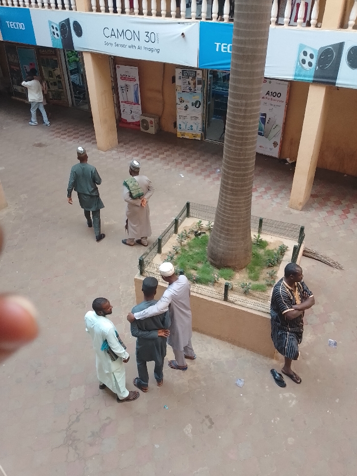 The image displays an outdoor commercial courtyard in Shaba, Nigeria, observed from an elevated perspective. The ground level is paved with square tiles in shades of reddish-brown and lighter beige. Six adult males are present. In the upper left quadrant, one male in a light shirt and light pants walks away from the camera. Towards the upper middle, two males in traditional long garments and caps walk away; one wears a green cloth draped over his right shoulder. In the lower middle, two males stand facing away from the camera; one in a light gray traditional garment has his right arm around the shoulder of another male in a dark gray traditional garment. To their immediate left, a male in a light-colored traditional garment stands, facing towards the interacting pair, with a light-colored object tucked under his left arm. To the right of the central group, one male in a dark, striped traditional garment stands with his arms crossed, facing right; a pair of black slippers are on the ground near his feet. A tall, textured palm tree trunk rises from a rectangular, raised planter located centrally in the courtyard. The planter, constructed of light brown material with a black metal fence, contains sparse green vegetation. Scattered litter, including paper and plastic, is visible on the tiled ground. The background features a two-story commercial building. On the upper level, two large banners are displayed: a white banner reads "CAMON 30 Sony Sensor with AI Imaging," and an adjacent blue and white banner displays "TECNO A100 For Everyone." Multiple storefronts with glass displays, showcasing mobile phones and other electronic devices, are visible beneath the banners. Light brown pillars support the upper floor, which is bordered by a white balustrade. The scene is illuminated by ambient daylight.