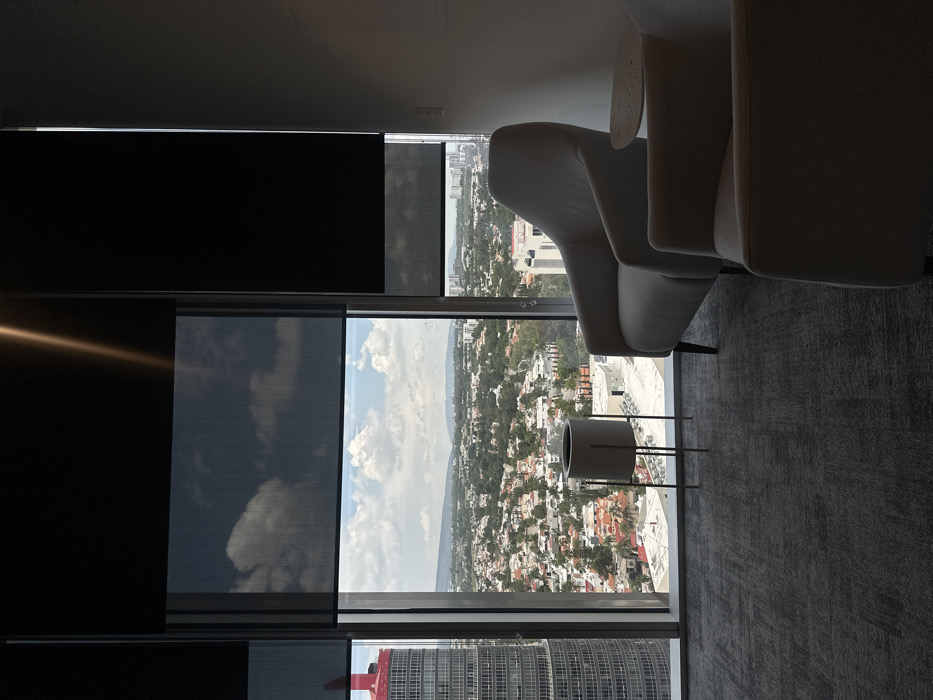 The image depicts an interior scene from a high-rise building overlooking the city of Zapopan, Mexico, during daylight hours