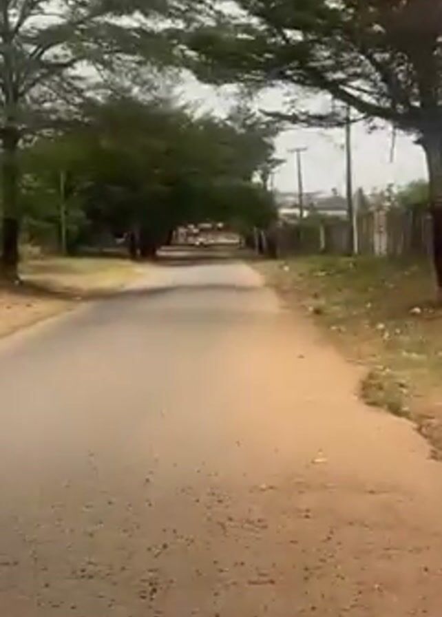 The camera travels down a paved road lined with trees. The trees overhang the road, providing a partial canopy. The sky is overcast. On either side of the road is dirt and low vegetation. There are walls or fences visible in the distance. At the end of the road, one or two vehicles are visible. The road appears to be deserted.