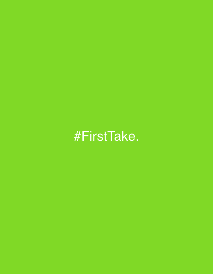 The scene, situated in Bangor, United Kingdom, presents a uniformly illuminated, solid lime green background. Centrally positioned on this background is the white text '#FirstTake.', rendered in a sans-serif typeface, followed by a period. No individuals, physical objects, discernible actions, or environmental features are present within the visual frame, which maintains a flat, monochromatic appearance.