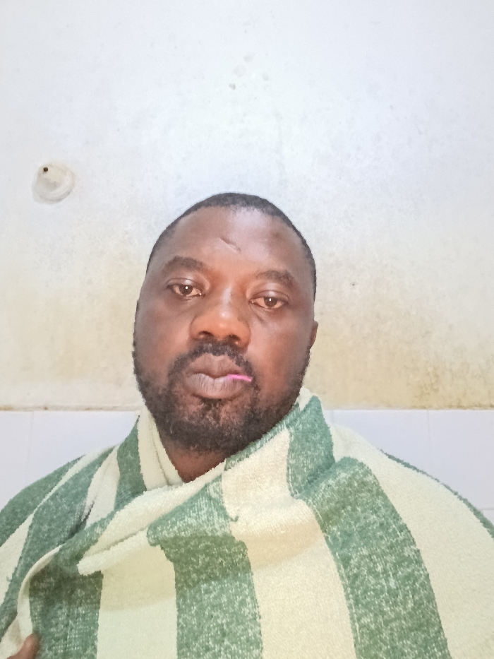 A man with dark skin, a beard, and close-cropped hair looks directly at the camera