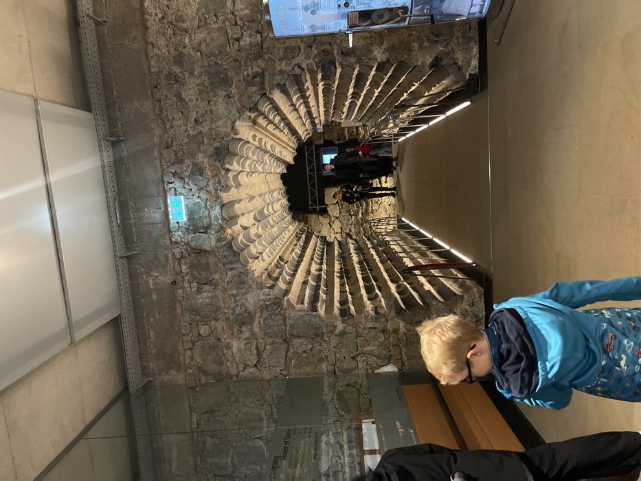 The image depicts the interior entrance to the "Ascent of Tower" within the Cologne Cathedral (Kölner Dom) in Cologne, Germany. The scene is characterized by rough-hewn grey stone walls and a modern light-colored panel ceiling with visible cable trays. A prominent archway dominates the midground, featuring a distinctive, repeating fan-like or scalloped stone pattern on its interior surface. Above this archway, a green emergency exit sign is affixed to the stone wall. A gently sloping ramp, illuminated by integrated LED strip lighting along its metal handrails, leads into the archway. In the foreground, a young blonde-haired child, wearing black-rimmed glasses, a blue hooded jacket, and patterned trousers, stands with his back partially to the camera, looking towards the right. To the far left, the lower half of an adult in black clothing is visible. Three individuals are visible entering the archway: one adult in dark attire, accompanied by two children. One child is dressed in dark clothing, and the other wears a red top or jacket. They are proceeding up the illuminated ramp. To the left of the archway, a transparent display panel exhibits text, clearly stating "BESTEIGUNG Ascent of Tower." To the right of the archway, a vertical digital or illuminated display, partially showing the word "SOUVENIRS," presents images and textual information.