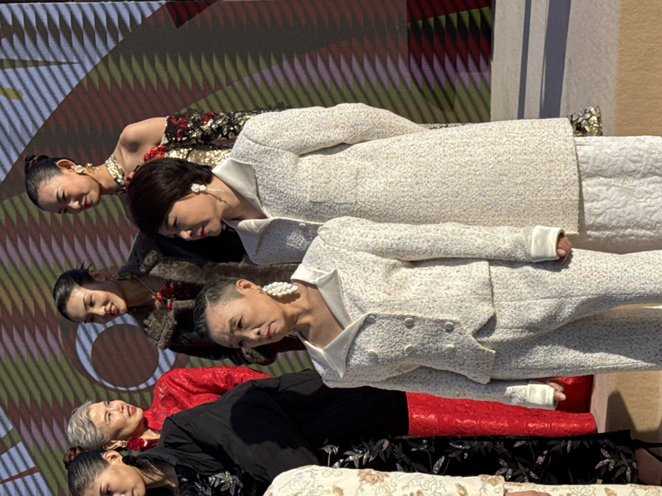 The image depicts eight Asian women standing on an outdoor platform in Chaoyang District, China, under direct sunlight. In the foreground, center, an older woman with short, close-cropped gray hair wears a textured off-white two-piece suit with colorful flecks, consisting of a double-breasted jacket with light satin lapels and matching wide-leg trousers. She is accessorized with large, layered white dangling earrings and exhibits a serious expression, looking towards the left. To her immediate right, another older woman with short dark hair wears a similar textured off-white long coat over a white, patterned skirt, complemented by white floral-shaped dangling earrings; her gaze is directed towards the center woman. A partially visible figure on the far left foreground wears a light-colored garment with a floral pattern. In the mid-ground, from left to right, are a woman in a black long-sleeved top and a black and silver patterned skirt, an older woman with gray hair in a vibrant red high-collared dress smiling to her right, and a younger woman wearing a textured dark brown coat over a dark top with a prominent red necklace. In the background right, a younger woman with dark hair pulled into a bun wears an off-the-shoulder gold, black, and red sequined dress with a high collar and gold dangling earrings, displaying a faint smile while looking slightly left. The background is dominated by a large screen or wall featuring an abstract geometric pattern with diagonal stripes and curved shapes in shades of green, purple, and red. The women are standing on a light brown platform.