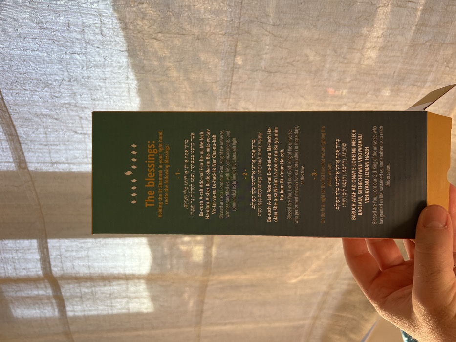 An indoor scene is depicted, illuminated by natural light entering from the right. The primary subject is a dark green, vertically oriented pamphlet or card, held by a person's right hand in the lower left quadrant of the frame. The pamphlet's front surface displays "The blessings:" in orange text at the top, accompanied by several stylized candle flame icons. Below this, three numbered Chanukah blessings are printed in Hebrew, transliterated Hebrew, and English translations. The English instructions specify "Holding the lit Shamash in your right hand, recite the following blessings." The visible portion of the hand shows fair skin and knuckles, with the thumb grasping the front of the pamphlet and fingers wrapped around its back edge. The background consists of a light-colored, possibly off-white or beige, sheer curtain with a discernible textured weave. Sunlight filters through the curtain, creating soft shadows and highlights that emphasize the fabric's folds and subtly reveal faint rectangular patterns, indicative of a window frame or external structures, through its translucence. The warm, natural illumination suggests either morning or late afternoon. The image provides no specific visual cues to confirm the location in Rafailovići, Montenegro.