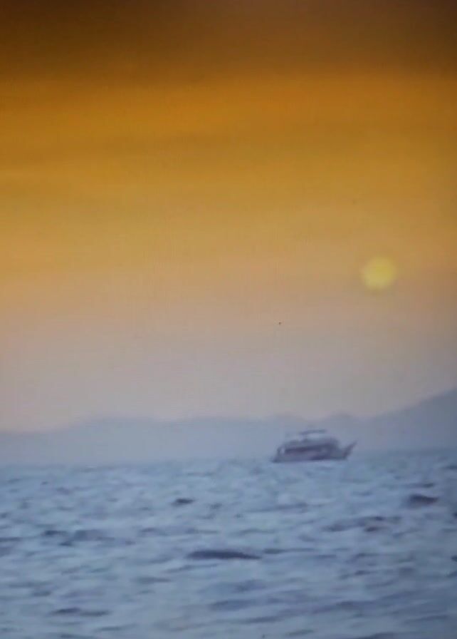 blurry, indistinct image. Initially, a body of water with gentle waves is visible, with a boat in the distance under a yellow sky. Later, the focus shifts to an even blurrier scene that could be a wooden structure or pier reflected in water. The poor resolution and lack of clarity make it difficult to discern details.