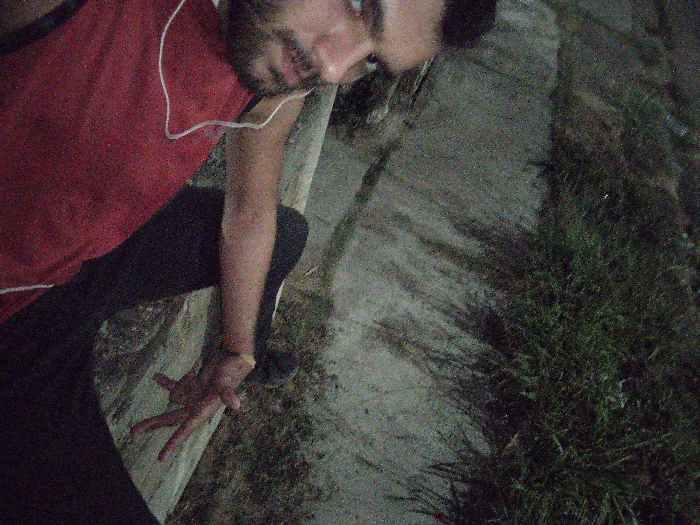 The image depicts an adult male in Tinaquillo, Venezuela, in a low-light setting. The individual possesses dark facial hair and short dark hair. He is attired in a red sleeveless shirt with white trim and dark trousers. White wired earphones are visible, draped over his left shoulder and extending towards his left ear. The male is observed in a crouching or kneeling position, leaning forward and to his right. His right arm is extended, with his right hand splayed, positioned above or in contact with a light grey, textured concrete or paved surface. This surface borders a darker green patch of grass or weeds, separated by a visible, slightly elevated edge.