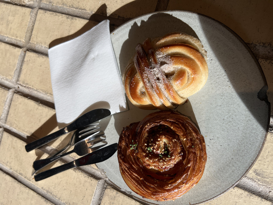 Two pastries rest on a light gray plate. One is a spiraled, light brown bun dusted with powdered sugar. The other is a darker, swirled pastry with seeds on top. A folded white napkin and two knives with a fork are positioned to the side of the plate. All items sit on a tiled surface, partially illuminated by strong sunlight.