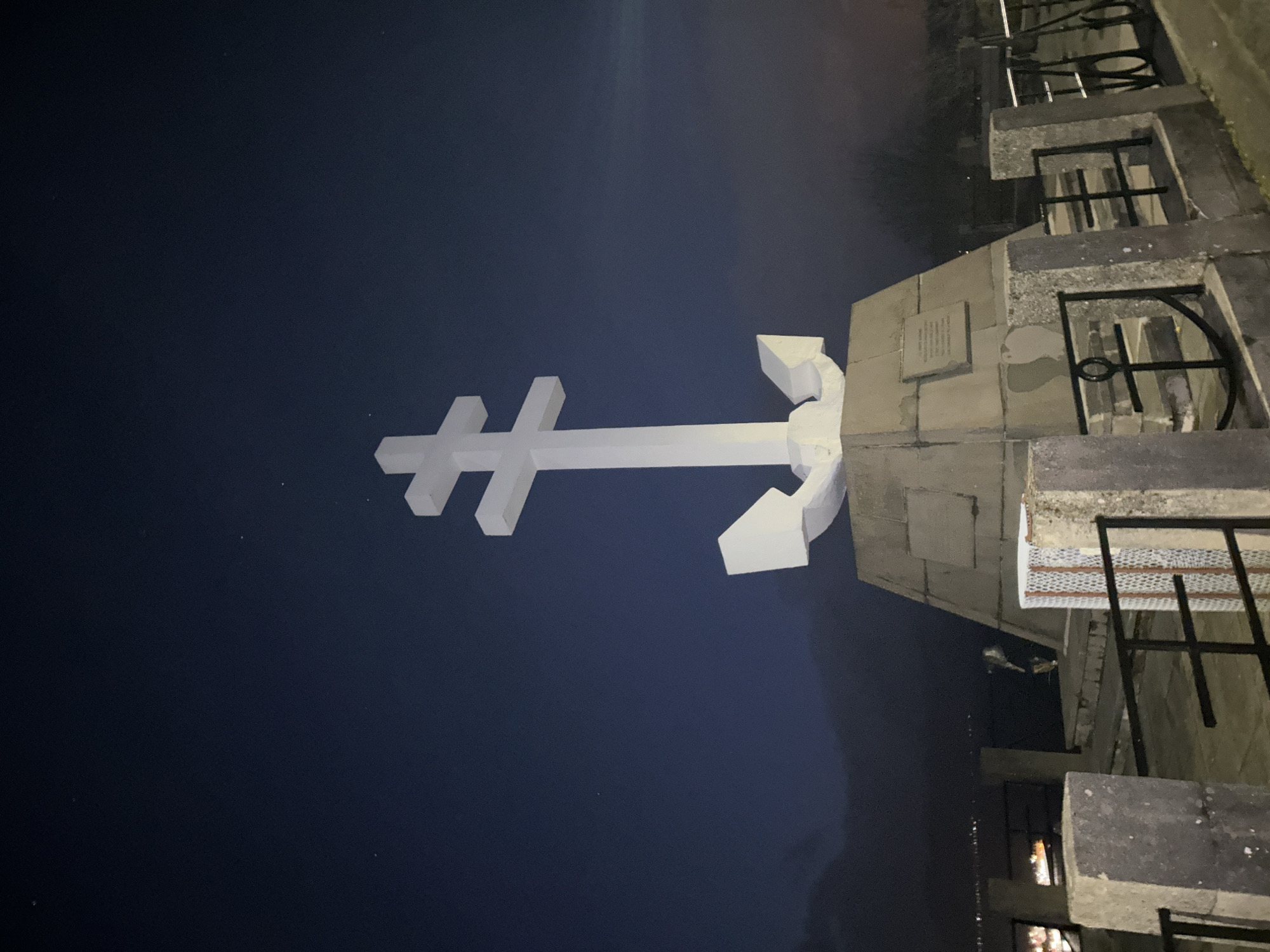 Free French Memorial in Gourock, United Kingdom. A white Cross of Lorraine, the symbol of the Free French Forces during World War II, is mounted on a stone plinth. The sky is a deep blue, suggestive of nighttime. To the right of the memorial are concrete structures with black metal railings.
