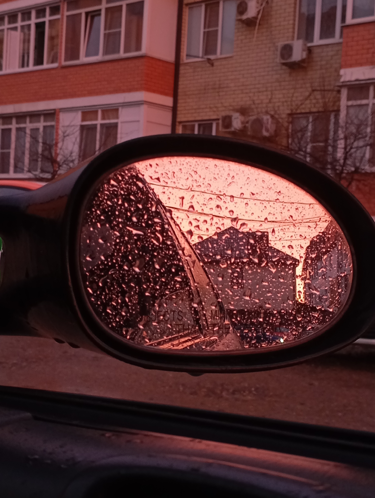 A close-up shot from inside a car shows the car's side mirror on a rainy day. Raindrops cover the surface of the mirror, obscuring the reflection. The reflection shows a building with multiple stories. Part of another building is visible above the side mirror. The buildings have a brick-like exterior. Air conditioning units are mounted on the building in the reflection. Bare tree branches are also visible in the reflected scene. The color of the scene appears to be a soft reddish-pink, suggesting either a sunset or the effect of artificial lighting. Based on visual characteristics, the location appears to be in Krasnodar, Russia.