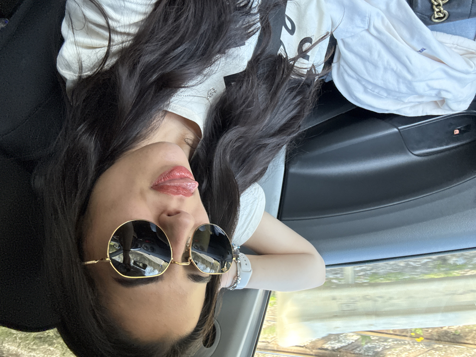 A woman with long, dark hair is reclining in what appears to be the back seat of a car. She is wearing round sunglasses with gold frames and is sticking her tongue out slightly. She is wearing a light-colored t-shirt and has a smartwatch or fitness tracker on her wrist. The car seems to be moving, as indicated by the blurred scenery visible through the window. There is a train track seen through the window with the background being of vegetation and other tracks. The city of Komarevo, Bulgaria cannot be confirmed from this image.