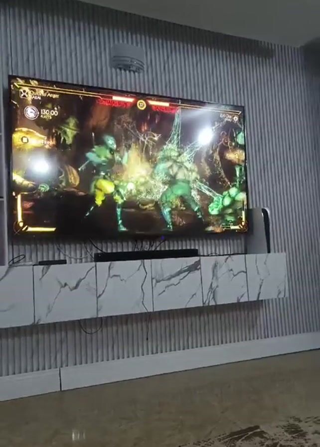 A flat-screen TV, showing a video game fight scene, is mounted above a white marble-patterned media console against a vertically striped wall