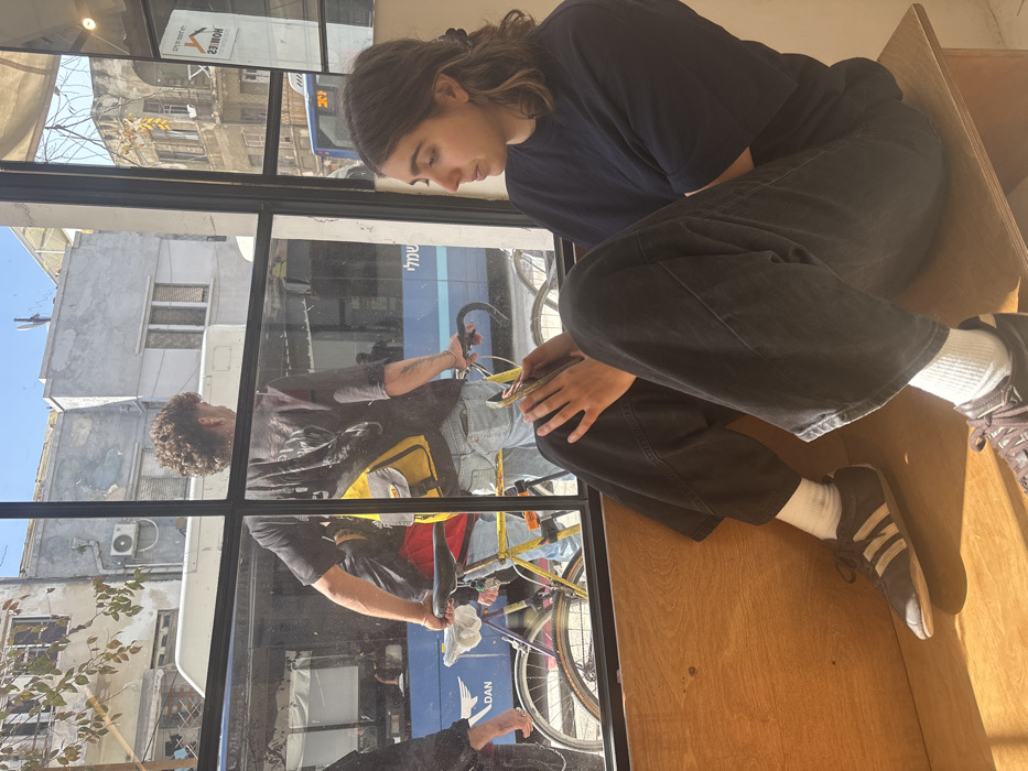 The image depicts an indoor scene looking out through a black-framed window onto a sunlit street in Tel-Aviv, Israel. Inside, to the right, a young adult female is seated on a light wooden bench, facing right and looking downward. She has dark, wavy hair and is wearing a dark blue t-shirt, loose dark trousers, white socks, and dark sneakers with white stripes. She holds a light-colored smartphone with both hands on her lap. Outside the window, a male with dark curly hair is seen from the back, standing beside a yellow-framed bicycle. He wears a black t-shirt, light-wash denim jeans, and a yellow messenger bag. A white cloth is visible on the bicycle seat. In the background, a blue public bus, operated by "Dan" (דן) and displaying partial Hebrew text, is stopped on the street. Across the street, several aged, multi-story buildings with weathered facades are visible under a clear blue sky, with some tree foliage present in the upper sections of the frame.