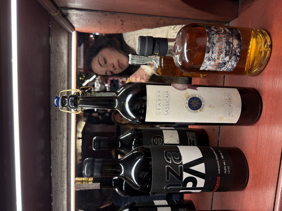 The image showcases a mirrored shelf stocked with various alcoholic beverages. The bottles include a brown liquor in a clear bottle with a patterned label, a bottle of Grappa di Solgheri Sassicaia distilled by Jacopo Poli, and a bottle of a red wine labeled "Iza Toscana" with an indication of 14.5% alcohol by volume in a 750ml bottle, labeled "L01/22". A woman's face is visible in the mirror's reflection, appearing to be resting or asleep. The lighting is a mix of artificial and natural light.