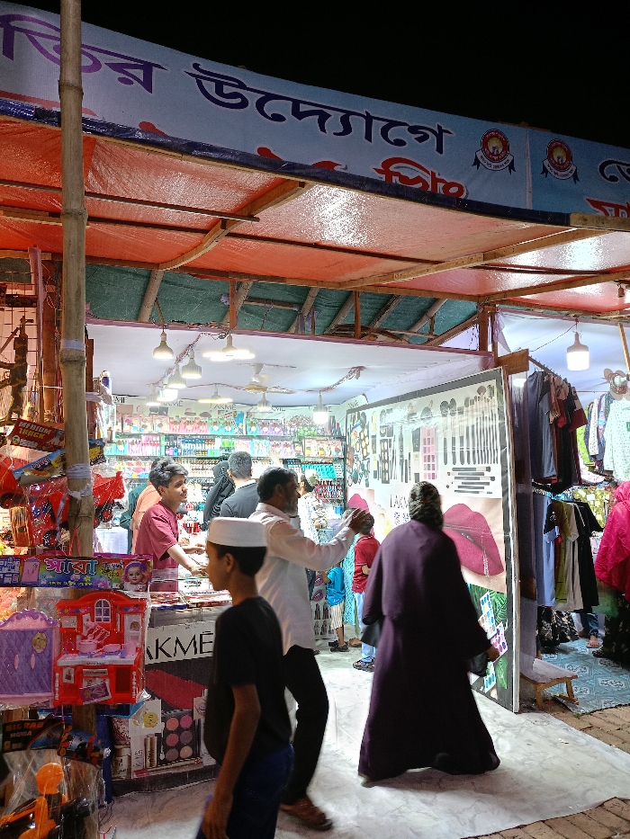 night market in Bhola, Bangladesh, located at 22.69 latitude and 90.643 longitude. The market is set up under a large awning, with several stalls lining the sides. The stall in the foreground is selling cosmetics and toys. Three men and one boy are interacting at the stall. There is a woman in a black robe standing in front of another stall, holding a bag. The wall of the stall behind the woman features images of makeup brushes and a large lipstick. There are clothes for sale on the stall behind the woman, including a blue shirt. The floor is tiled and there are several chairs scattered around the market. The scene is lit by several overhead lights. The awning is made of a red and white striped fabric. There are signs above the stalls, written in Bengali. One sign reads “Jib Ontorale”.