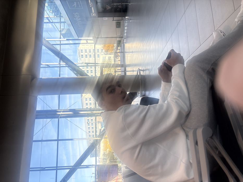 A male individual is seated in an airport terminal, specifically Terminal 1, near the "Arrivées / Arrivals" section, at Lyon-Saint Exupéry Airport in Colombier-Saugnieu, France