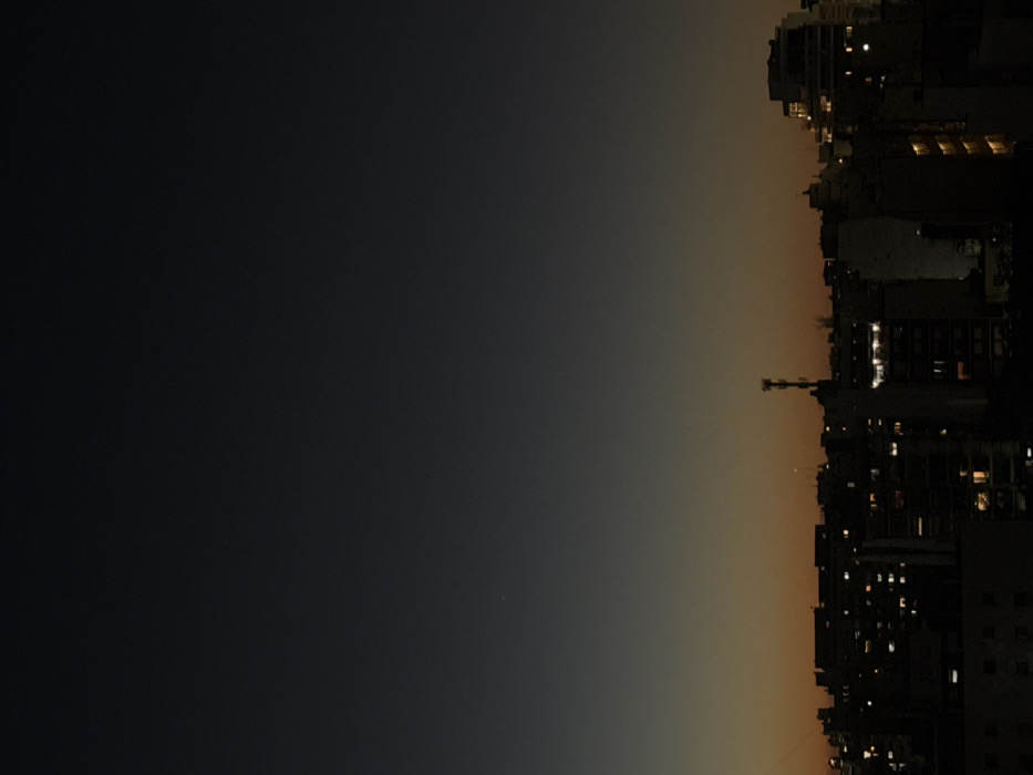 The image depicts a cityscape at night. Buildings, illuminated by interior lights, stretch vertically along the right side of the frame. A solitary antenna stands amidst the structures. The left side displays a gradient sky transitioning from dark to a lighter, dusky hue as it approaches the buildings. A single, small point of light punctuates the sky, possibly a star or distant light source.
