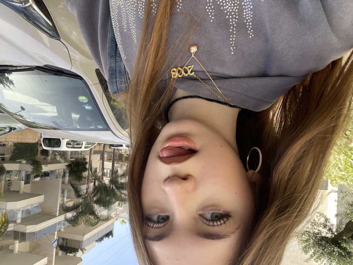 A young female is depicted in a close-up, chest-up photograph, facing the viewer with her gaze directed forward. She has light skin, long light brown hair flowing over her shoulders, and blue-green eyes with prominent eyelashes. A small ring-shaped piercing is visible on her right nostril. Her lips are slightly parted, and her tongue is partially extended. She is wearing a grey hooded sweatshirt featuring a pattern of light-colored embellishments on the chest. Around her neck, she wears a black choker and two layered gold-colored necklaces: one with a small circular pendant and another with the text "2008". Gold-colored hoop earrings, each adorned with small stones, are visible in her ears. A denim-textured strap, possibly from a bag or garment, is visible over her right shoulder. The background depicts an urban residential street scene, consistent with the city of Raanana, Israel. Multiple multi-story residential buildings with light-colored facades and balconies are visible. An Israeli flag is affixed to a pole on an upper balcony of a building on the right side. Palm trees and other green foliage are interspersed between the buildings and along the left side of the frame. A light-colored sedan or hatchback is parked in the foreground on the right, with its front bumper, headlight, hood, and windshield partially visible. Additional vehicles are parked further down the street. The sky is clear and blue, indicating daytime conditions.