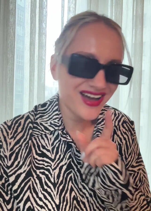 A woman with blonde hair pulled back into a bun stands in front of a window with sheer curtains, wearing large black sunglasses and a black and white zebra-print shirt