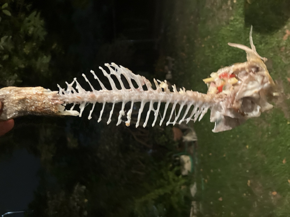 A close-up, vertical image, reportedly captured in Brener Regional Council, Israel, depicts the skeletal remains of a fish. An individual's light-toned fingers are visible at the top, grasping the superior portion of the fish's spine. The skeleton is largely denuded of flesh, revealing white bone structures including the head, a complete vertebral column, and numerous ribs. Some remnants of cooked, light brown flesh and a viscous white substance adhere to the upper spine. The fish's head cavity contains fragments of diced red and white/yellow material, appearing as a cooked filling or garnish. The scene is dimly lit, suggesting nighttime. The background is out of focus, displaying dark green grass at the bottom, and indistinct dark foliage from trees and shrubs, indicative of an outdoor, garden setting.