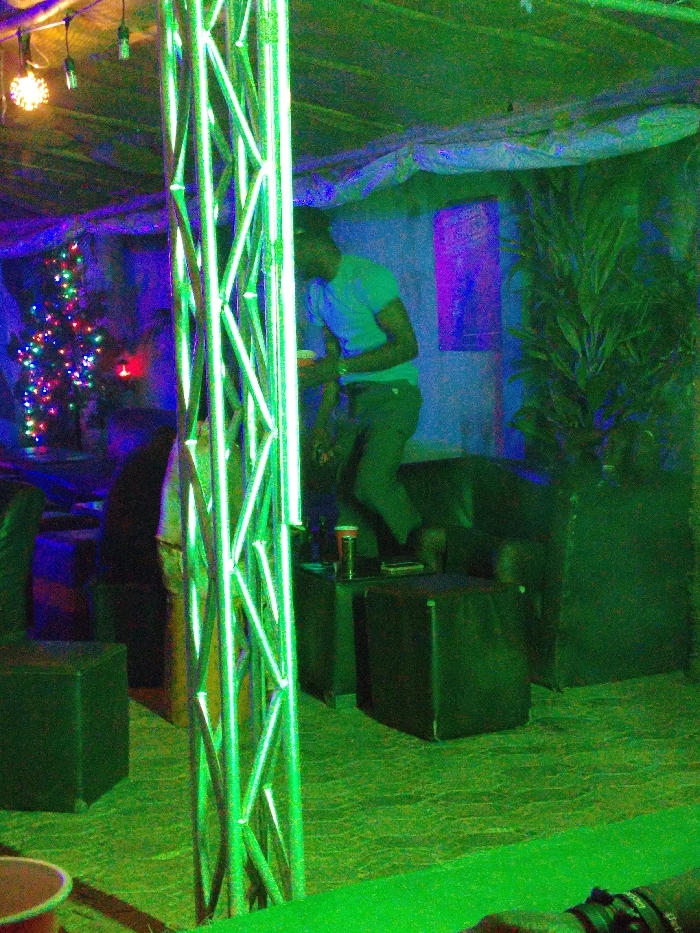 An indoor scene with green and purple lighting shows a man in a light blue shirt and dark pants standing next to a dark sofa and a potted plant. A tall, illuminated metal structure stands prominently in the foreground. A Christmas tree adorned with lights is visible in the background, along with other indistinct figures. Dark furniture, including cube-shaped seats, is scattered around the room. A cup is on the floor near the bottom of the frame.