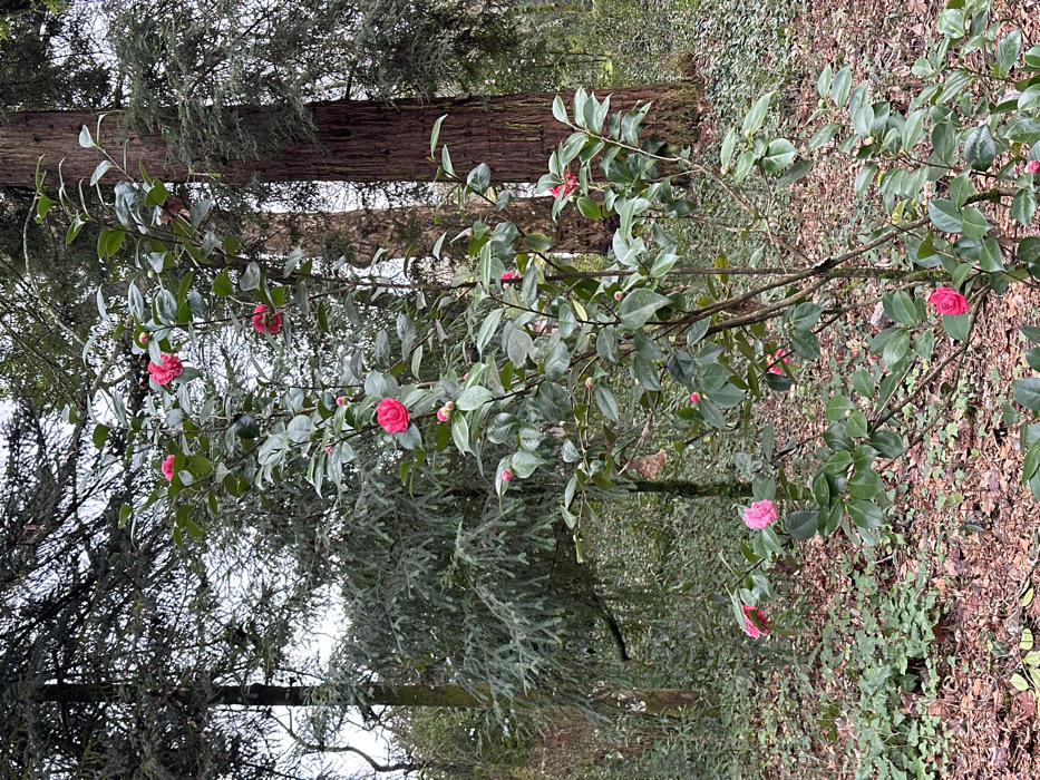 An outdoor scene in Amarante, Portugal, features a Camellia bush centrally positioned, approximately 2.5 meters in height. The bush displays numerous pink and reddish-pink flowers, some fully open and others in bud, amidst its dark green, glossy foliage. The forest floor is covered with a layer of brown, fallen leaves interspersed with patches of green ground cover. The background consists of a dense arrangement of trees, including tall conifers with dark green needle-like branches and thick trunks, notably a reddish-brown tree trunk visible on the right side. The ambient light indicates an overcast sky. No individuals, animals, or man-made objects are present.