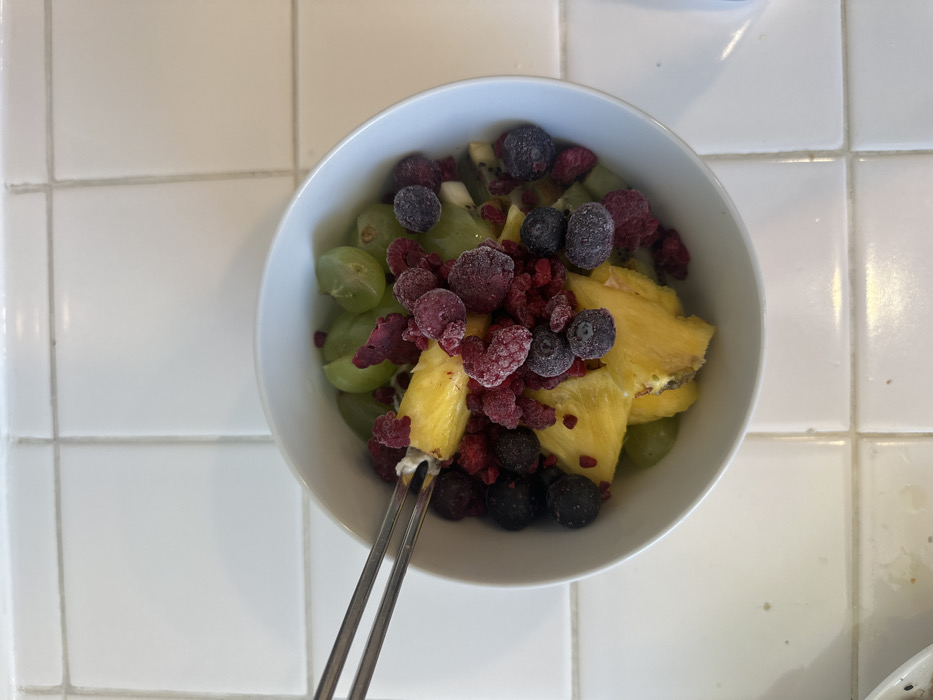 A white ceramic bowl containing a fruit mixture is centered on a white tiled surface in Newport Beach, United States